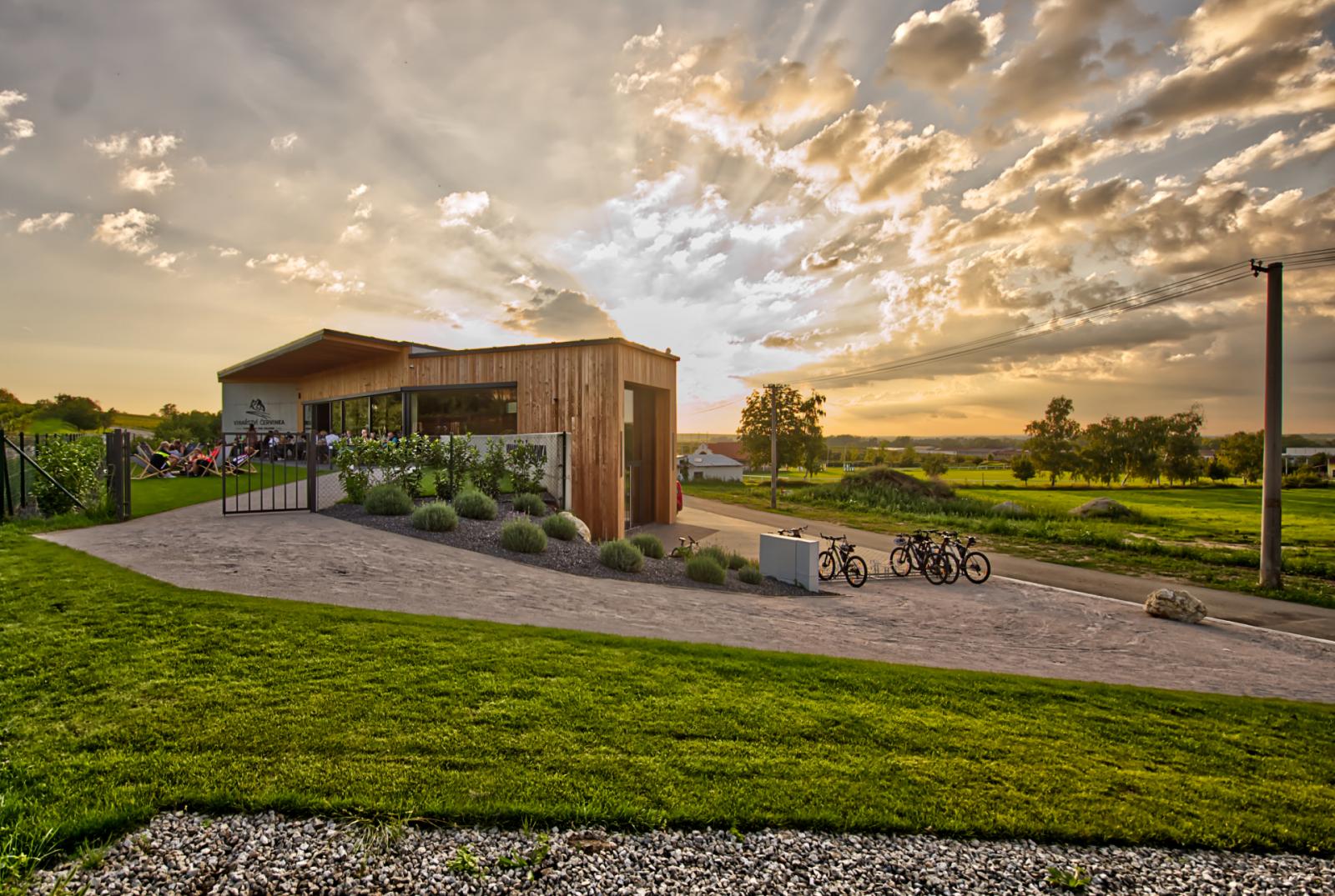 Das Gebäude dieses Weinguts in Pavlov mit dem lustigen Namen Přátelé Pavlova (die Freunde Pavlovs) steht wiederum inmitten der Weinreben. Der Entwurf des Ateliers Štěpán wirkt wie eine spartanisch schlichte Scheune in ultranatürlicher Form mit einem begrünten Flachdach. Beim Bau wurde wo nur irgend möglich eine enge Auswahl an örtlichen Rohstoffen verwendet. Dabei dominieren zwei Materialien – gegossener Stahlbeton für die Außenwände und Holz für die Dachkonstruktion. Im Innern sorgt die Kombination des strengen grauen Betons mit dem markanten Holzton für spannende Kontraste. Architekt Štěpán respektierte die Lage im Landschaftsschutzgebiet Pálava und wählte daher eine geringe Bauhöhe und ein mäßig geneigtes Dach, das gekonnt den Landschaftsverlauf kopiert. Von der Drohne oder den Pollauer Bergen aus gesehen wirkt der Bau nicht wie die Faust aufs Auge – er passt sich der Vegetation und verschmilzt mit der Landschaft. Aus dem Fenster des Degustationsraums (Besuche bitte vorher vereinbaren) fällt der Blick auf die Silhouette der Burgruine Děvičky, von anderen Stellen aus wiederum auf die Wasserfläche der Stauseen von Nové Mlýny.