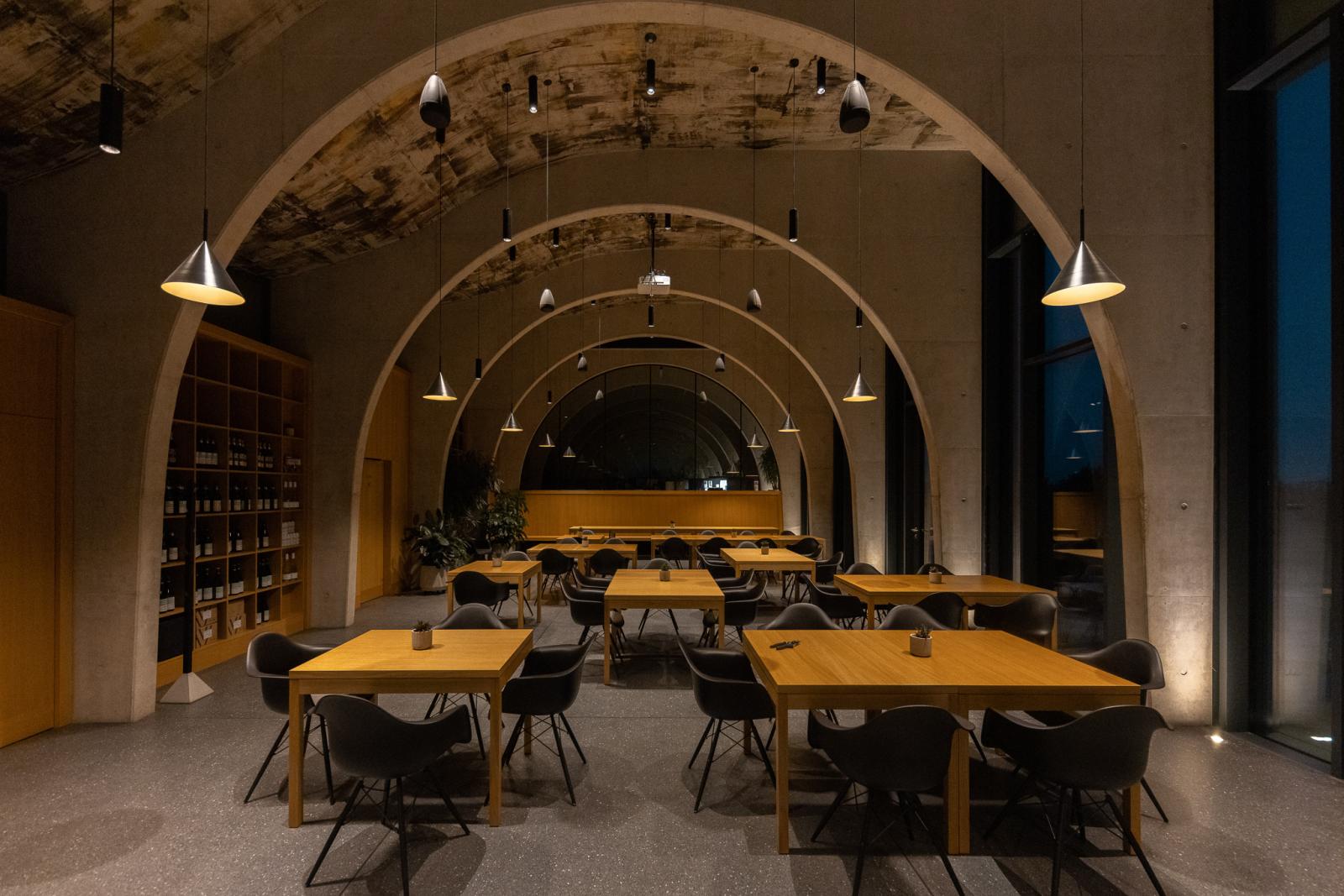 Auch der repräsentative Sitz des ganz in der Nähe bei Dobšice gelegenen Weinguts Lahofer ist auf dem Reißbrett von Chybík+Krištof entstanden. Das zum Bau des Jahres 2020 gekürte Weingut fügt sich auf originelle Weise in die umgebende Landschaft ein – es spiegelt den welligen Verlauf der Hügel wider, während die Kolonnade aus Gewölberippen den Rhythmus der umgebenden Rebreihen übernimmt und damit auch dem Interieur ein mit dem Wein verbundenes Motiv verleiht. Eine gewaltige Betonwelle verbindet den Produktionsbereich in dem einen höheren Gebäude mit dem Degustationssaal im anderen, das dazwischen entstandene Wellental dient als Freilichtbühne für Kulturevents. Kommen Sie zu einer Weinprobe in die LAHOtéka, oder wählen Sie aus dem Kulturkalender zum Beispiel ein Konzert unter freiem Himmel.