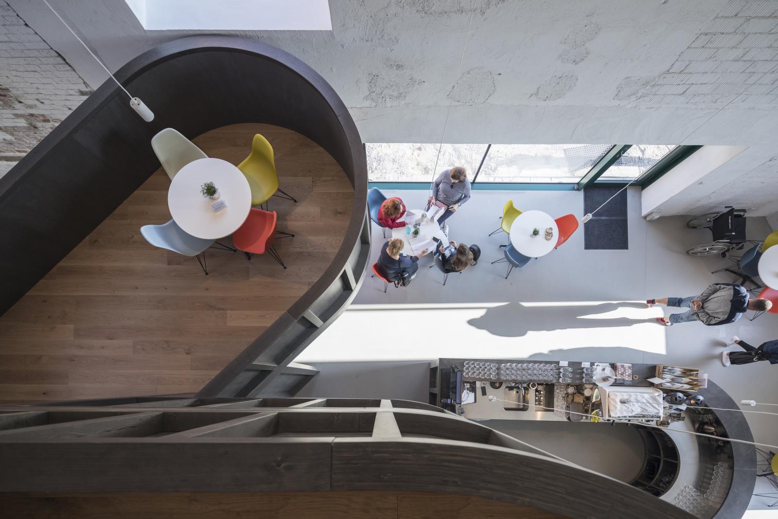 Das unansehnliche Gebäude neben der sorgsam renovierten Brauerei wurde von Chybík+Krištof in experimentaller Weise angegangen. Sie ließen nur die Außenwände und fügten in das schneeweiße Interieur in unterschiedlichen Höhen mehrere Sitzbereiche aus dunklem Holz ein. Lassen Sie sich nicht den Aufstieg bis zur obersten „Box“ entgehen, von wo sich schön das Treiben an der Bar tief unter einem beobachten lässt! Durch die asymmetrischen Fenster der Enotéka fällt bei einem Wein oder Kaffee der Blick auf die mehr als 800 Jahre alte gotische Nikolaikirche. Bei einer Weinprobe im benachbarten Raum lenkt nichts Ihre Sinne ab. Dank des Selbstbedienungssystems by the glass können Sie die Weine des Anbaugebiets in kleinen Mengen ganz nach Ihrer Wahl und Ihren Kräften verkosten (Sorten gibt es über hundert!).